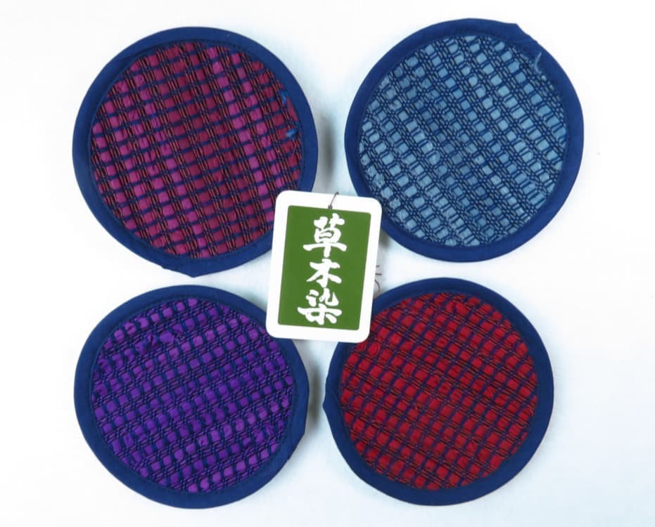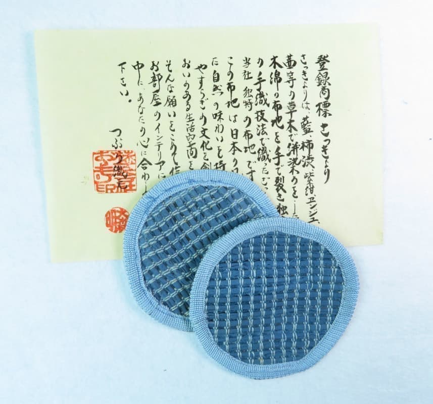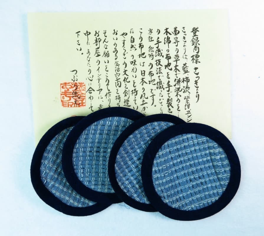 独特の織り“さっきょり”のコースターは京都の老舗料亭やオシャレなカフェでもお使いいただいております。裏も藍染め生地を使用しています。